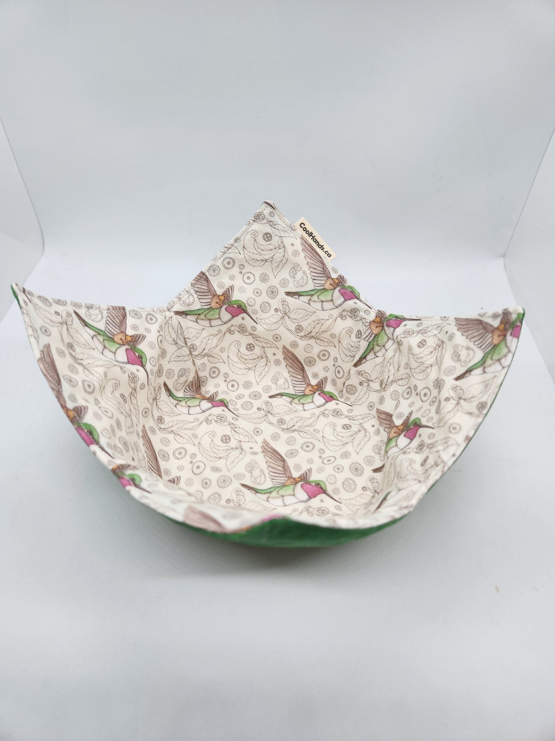 High quality 100% cotton, microwavable bowl cozy, machine washable. Fits a standard bowl with a 4-8 inch diameter.